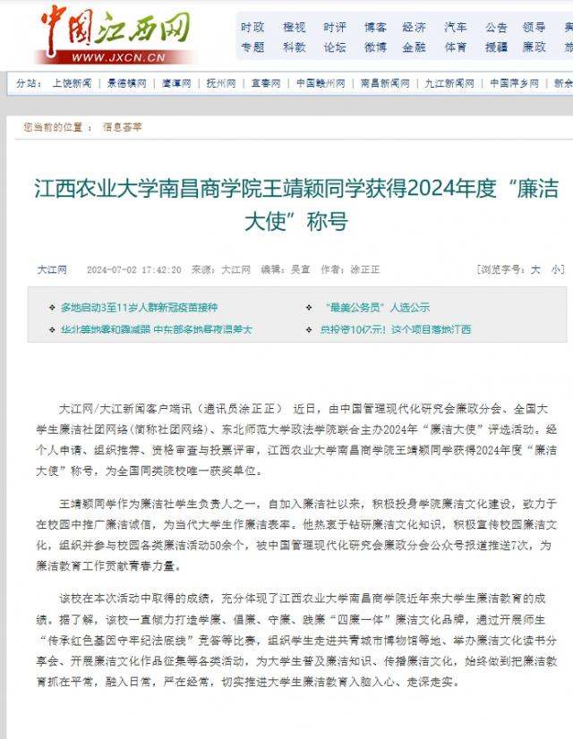 【中国江西网】Beat365官方网站王靖颖同学获得2024年度“廉洁大使”称号