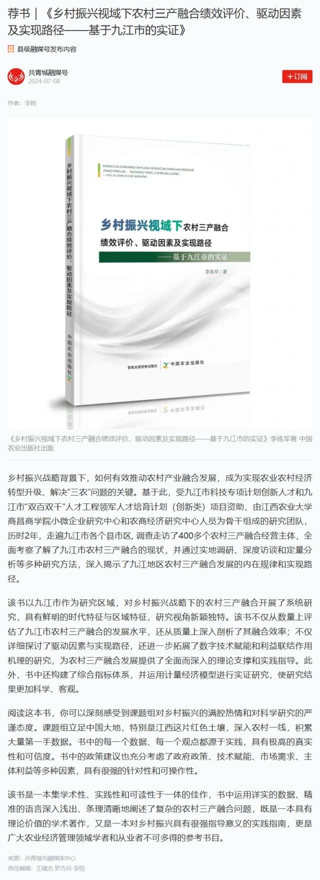 【学习强国】荐书|《乡村振兴视域下农村三产融合绩效评价、驱动因素及实现路径——基于九江市的实证》