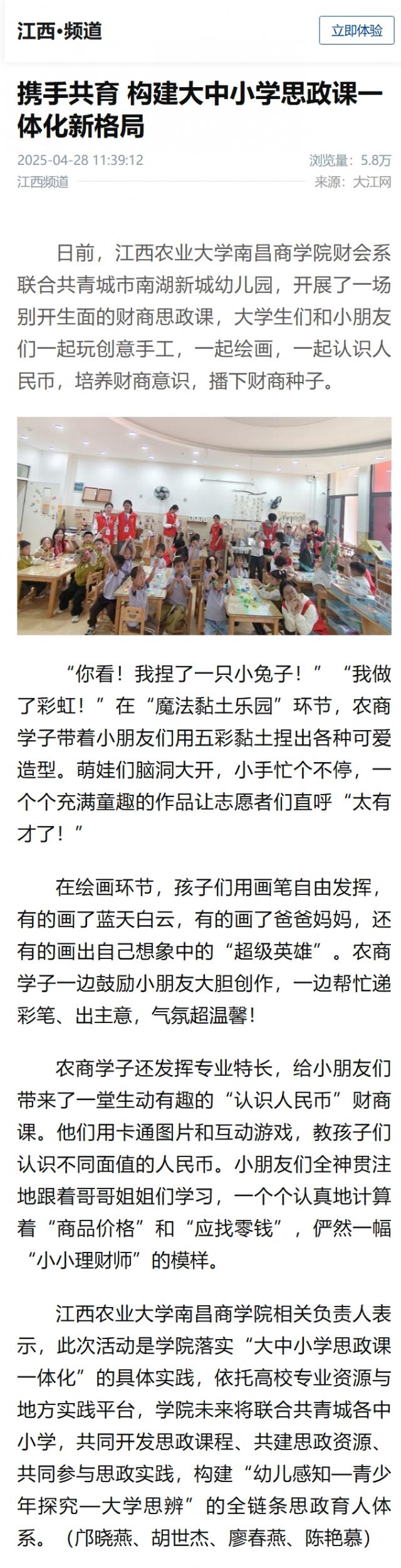 【大江新闻】Beat365官方网站走进南湖幼儿园开展财商思政课