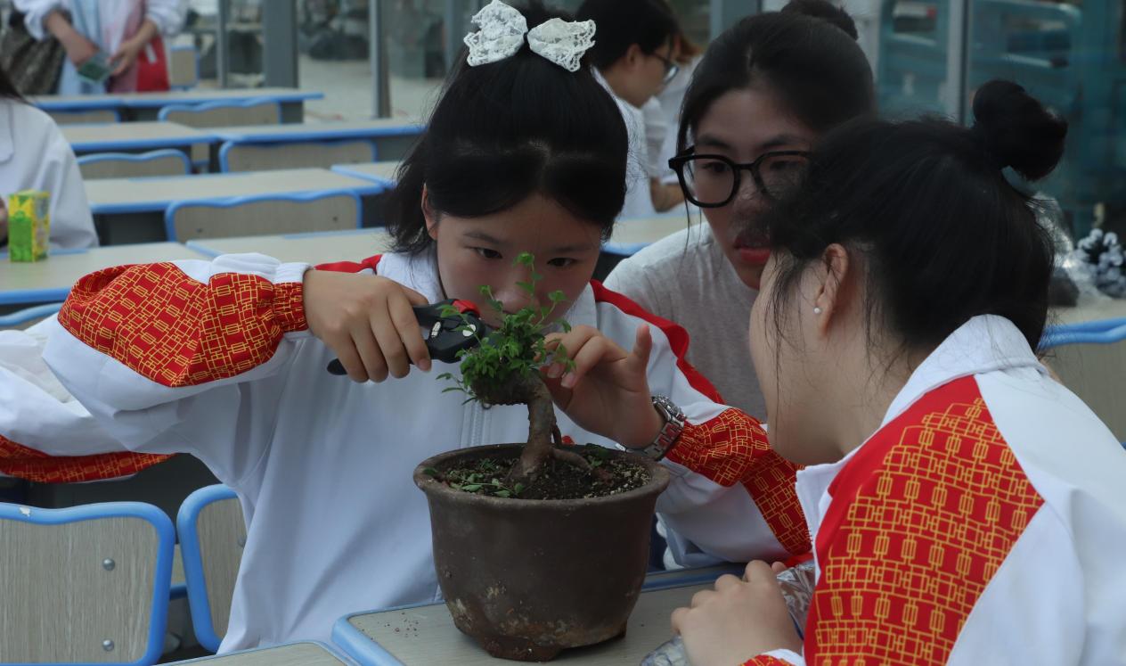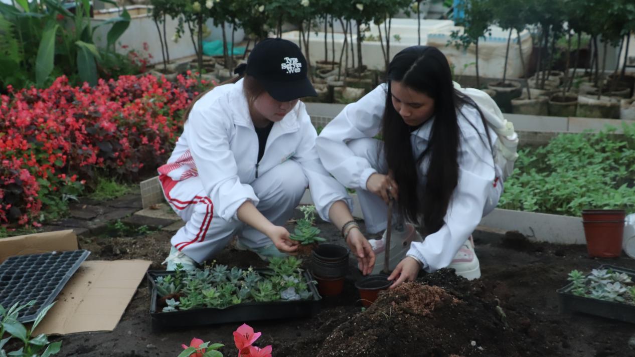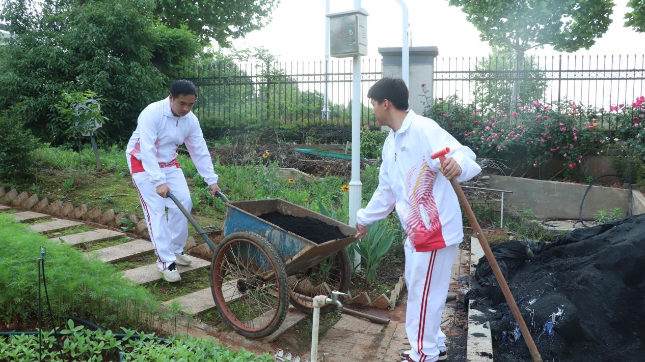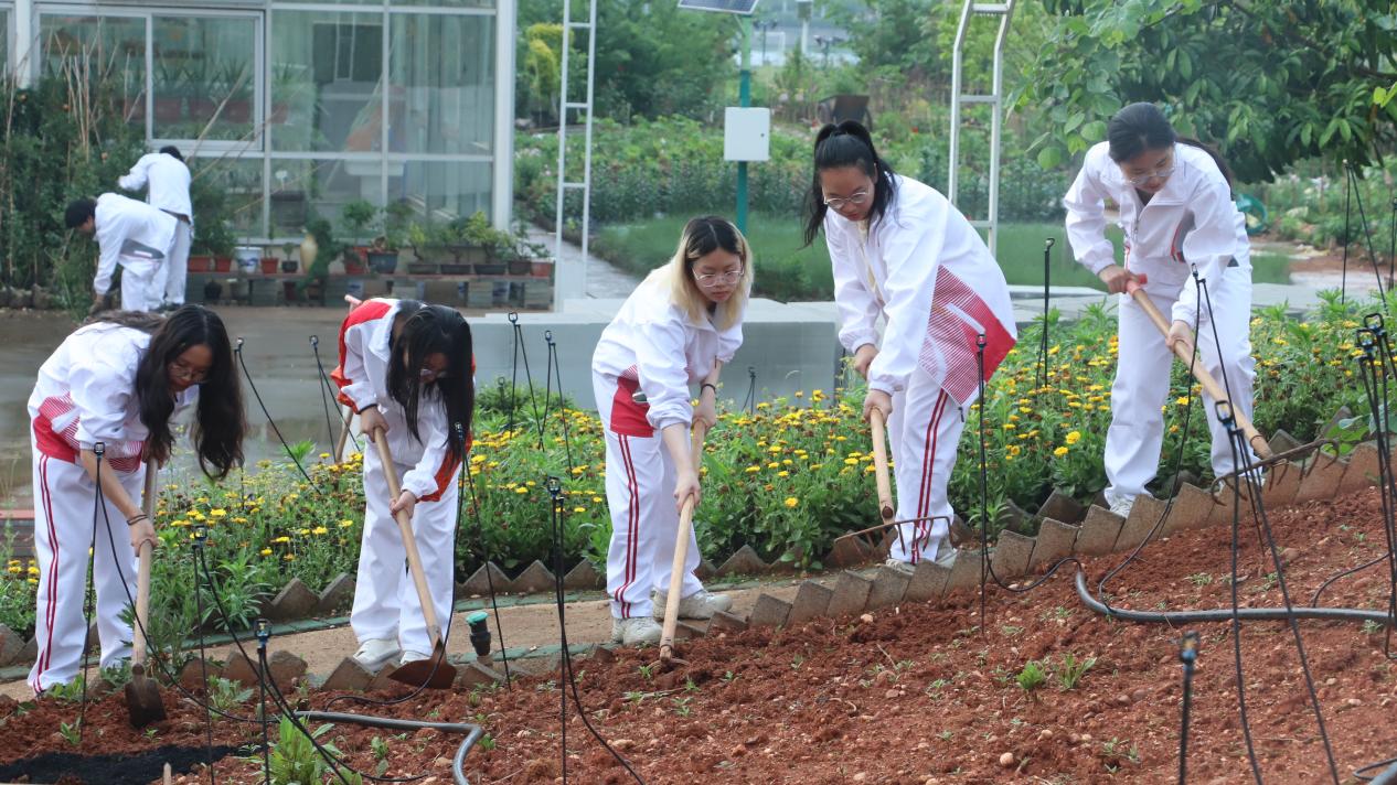 活动伊始,全体成员抵达基地后,在乐老师的指挥下分组,展开劳作:翻土组挥锄松土,破除板结田垄;翻土结束后,组员将草木灰均匀筛撒于田垄表层,灰烬与雨水交融,形成一层保温保湿的天然屏障。播种组指尖点豆,将豆种粒精准埋入腐殖层;花卉组穿梭于玻璃花房,移植月季,逐一将多肉植物移植至陶盆。活动尾声,泥泞的田埂间未留一片垃圾,工具使用后悉数归位。新栽的苗木行列齐整,移植的绿植错落有致,成为鲜活的美育素材。