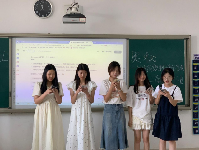 “AI单词炸弹”游戏环节,同学们在紧张刺激的氛围中比拼词汇能力。“你比我猜”环节,两人一组默契配合,用生动的肢体语言和简洁的外语表达传递信息。“红色歌曲猜猜猜”环节,伴随激昂的旋律,同学们踊跃抢答。“单词接龙”环节考验同学们的词汇储备和反应速度,现场气氛欢快热烈。