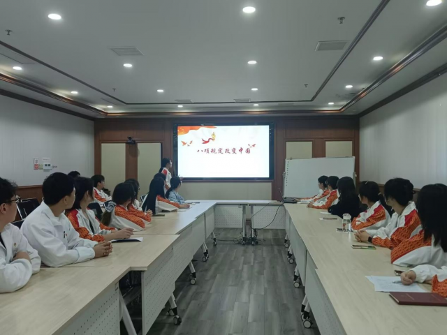 学生党员刘凤玲领学了中央八项规定的具体内涵和重要意义,随后全体党员集中观看专题纪录片《八项规定改变中国》。该片以生动的画面、深刻的剖析,全景式展现了中央八项规定出台以来,党风、政风、社风发生的翻天覆地变化。