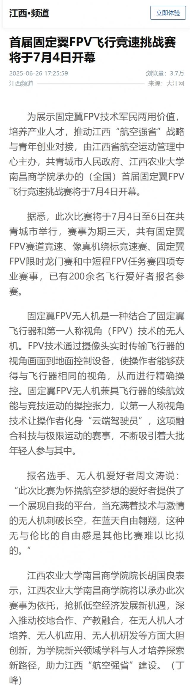【大江新闻】首届固定翼FPV飞行竞速挑战赛将于7月4日开幕