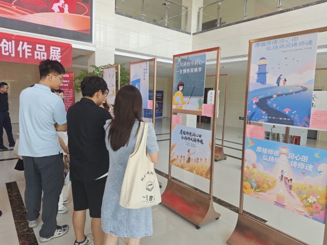 9月11日下午,语言与文法学院党总支组织全体教师前往明道楼一楼大厅,参观由教师工作部举办的第41个教师节师德文创作品展,以沉浸式学习深化师德师风建设,践行“厚植师德润心田,弘扬师风铸师魂”的教育理念。