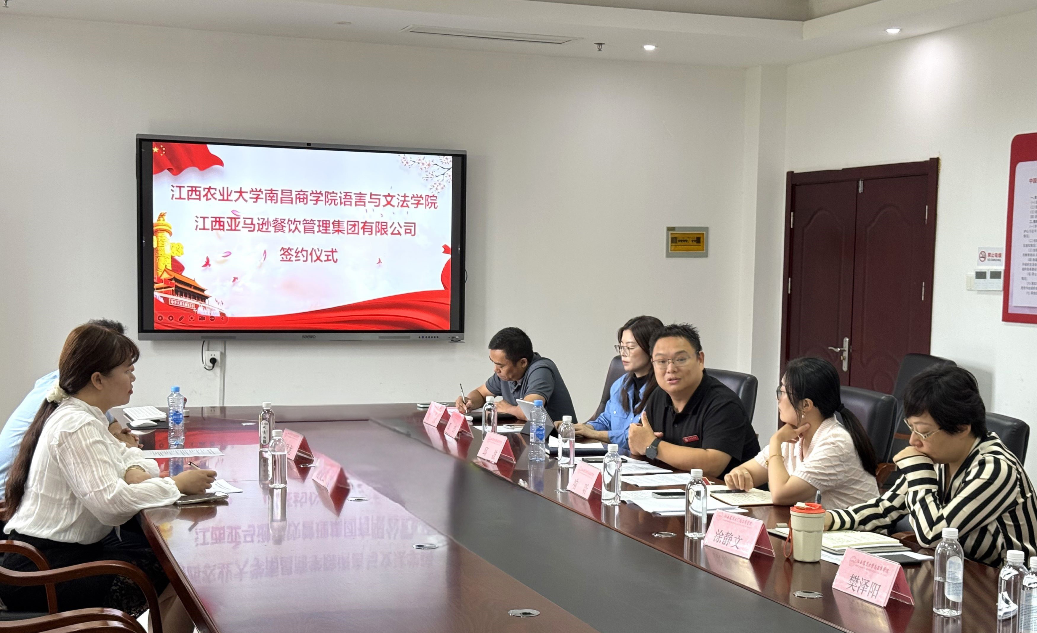 为深入推进产教协同育人,9月24日上午,语言与文法学院与江西亚马逊餐饮管理集团有限公司在明道楼B221会议室联合举行产教融合签约仪式,文法学院联系院领导邱波、教务处副处长涂静文、文法学院副院长喻昕等校方师生代表,亚马逊集团运营中心副总经理舒显龙、人事经理蒋爱云共同参加。