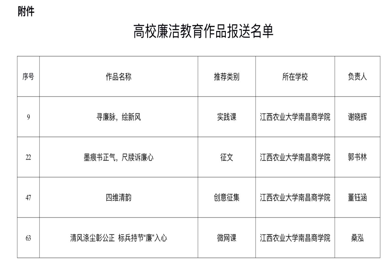 近日,根据教育部办公厅《关于举办第十届高校廉洁教育系列活动的通知》(教思政厅函〔2025〕14号)要求,经高校推荐、专家评审,由学院纪委选送的实践课作品《寻廉脉,绘新风》、征文作品《墨痕书正气,尺牍诉廉心》、创意征集作品《四维清韵》及微网课作品《清风涤尘彰公正 标兵持节“廉”入心》在省级评选中入围获奖,将由省教育厅推荐参加全国评选,入选数量在省内同类院校位列第一。(文、图/纪委综合办公室,审核/黄小岭)