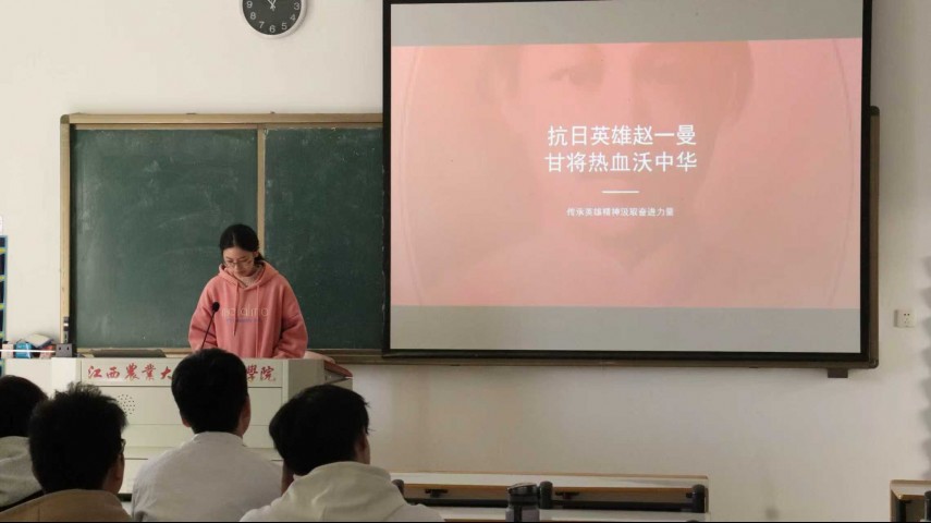 11月28日,学生党员卞新月讲述《抗日英雄赵一曼》的英勇事迹,通过感人至深的革命故事,让同学们深刻体会到抗日先烈为国家和民族挺身而出的无畏气概。