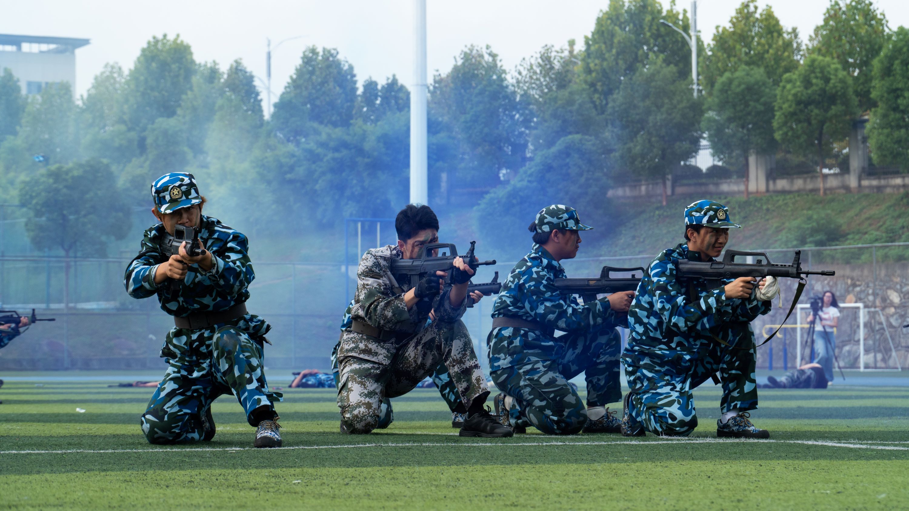 分列式后,军训单科项目展示上演:刺杀操方阵出枪凌厉,尽显锋芒;应急棍表演整齐划一,展现过硬技能;女子匕首操挥刃飒爽,彰显巾帼风采;军体拳方阵拳脚生风,饱含青春热血。战术方阵中,学员依托仿真装备开展实战化模拟训练,动作协同紧密、场景还原逼真,生动展现新生队伍严明的纪律作风与高效的团队协作水平。