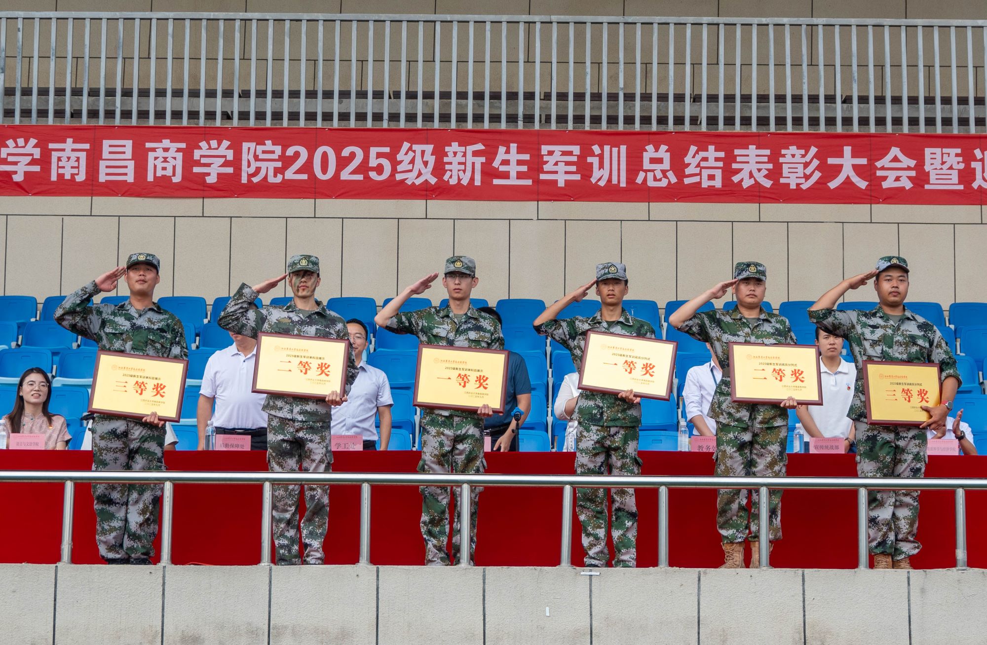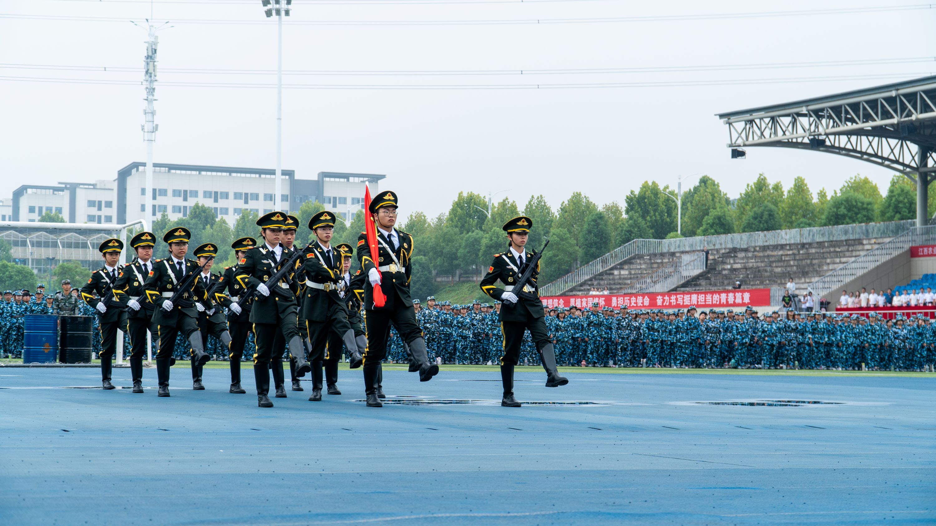 随后,以数据科学与经济学院为首的六支新生方阵依次进行分列式表演,他们身着统一军训服,迈整齐正步、喊嘹亮口号,以挺拔军姿与标准动作展现两周军训成果,赢得现场阵阵掌声。