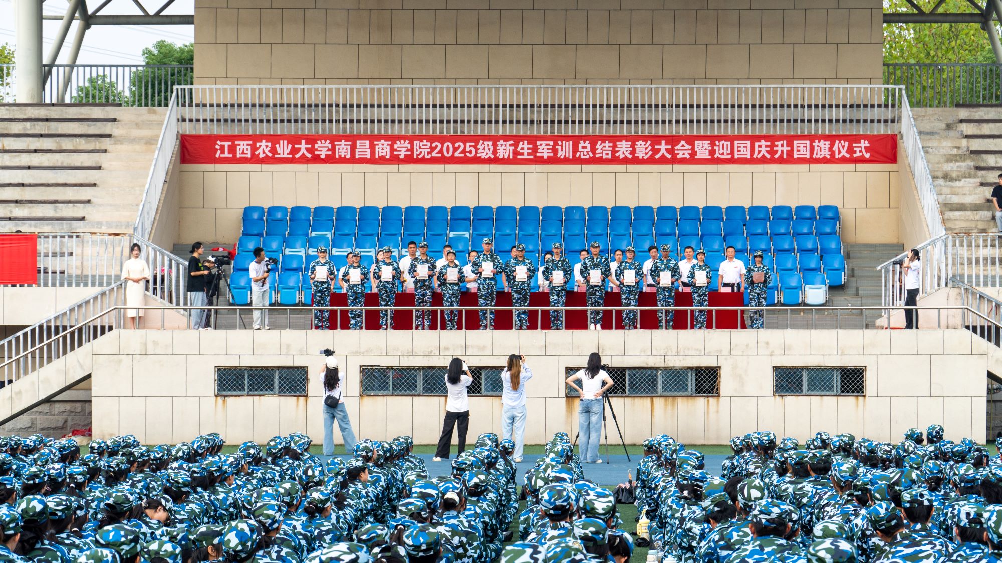 9月30日上午,学院在田径场举行2025级新生军训总结表彰大会暨迎国庆升国旗仪式。副院长侯英梅、徐发亮,学院各职能部门负责人,2025级全体新生、辅导员及承训教官参加。