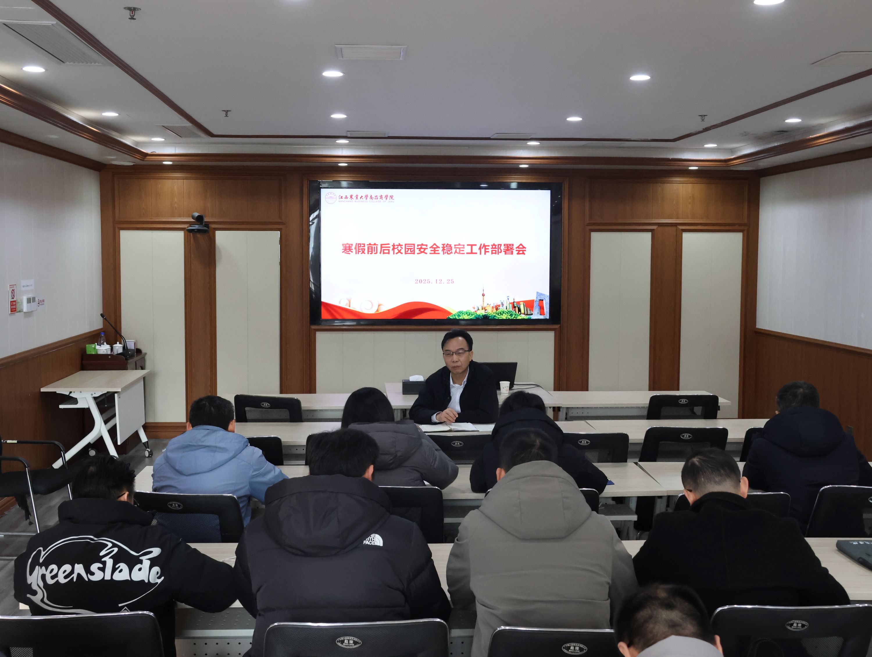 为贯彻落实上级会议精神,切实做好寒假期间校园安全稳定工作,12月25日上午,学院在明道楼203会议室召开寒假前后校园安全稳定工作专题会议。院长胡国良进行工作部署,各相关职能部门负责人、各学院党总支书记参加。