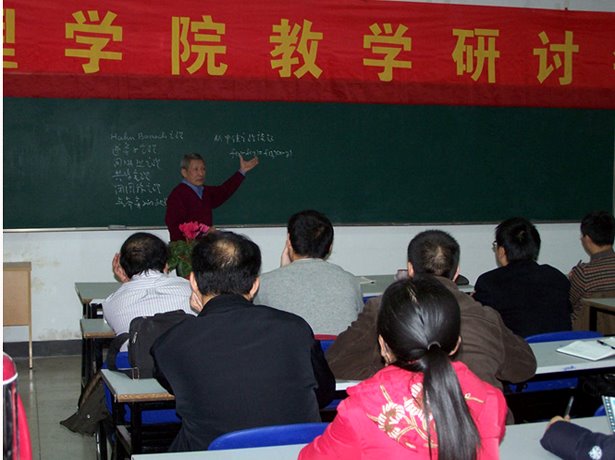 在下午的教学研讨会上,南京大学博士生导师沈祖和教授根据自己多年从事数学研究的体会和经验,做了“从问题入手进行数值泛函分析教学和研究”的专题报告。他从“中值定理的内涵”和“求解数学物理方程的泛函分析方法”两方面介绍了如何从问题入手进行数学教学,沈老师博大精深的数学功底和深入浅出的数学抽象概念的引入方法,使与会的全体数学教师感触很深,都陶醉在沈老师的精彩讲解之中,以至于讲解结束后纷纷要求沈祖和教授再讲一会,沈祖和教授又就如何从问题入手进行数学研究谈了自己的看法,指出进行广泛深入的数学研究是搞好数学教学的前提。