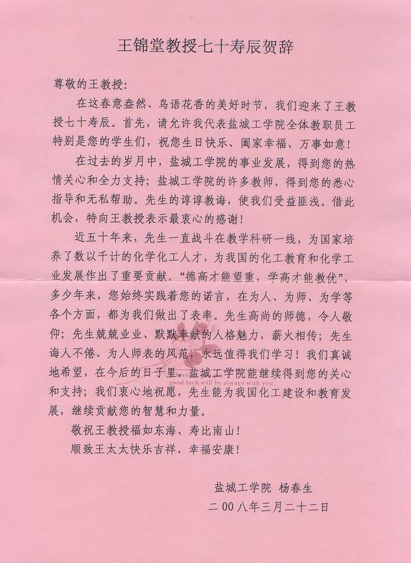 参加这次活动的主要有王锦堂教授的博士生和硕士生,他们工作在南京大学、南京理工大学、中国药科大学等20多个高等院校、政府机关、研究院所和企业,是这些单位科学研究、教学、管理的骨干和带头人,还有闻讯赶来的王老师最早的弟子毕业于上世纪六十年代的来自燕山石化的庞如振高工,盐城工学院的杨春生院长发来了热情洋溢的贺信。