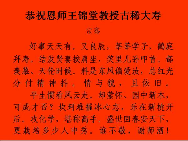 阅读次数: 发布时间:2008-04-083月22日-23日,王锦堂教授的来自全国各地的80多位弟子齐聚江浦校区庆祝恩师王锦堂教授执教50年暨70华诞。