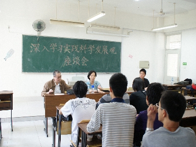 整个活动分为5个小组进行,每个小组的活动都是在同学们热烈的掌声中开始。关工委的老同志们首先结合学校“推进科学发展,建设有特色高水平大学”的主题,就科学发展观深刻内涵、精神实质和重要意义及其与学校发展、个人发展中的关系等问题向同学们作了详细的讲解,以便大家对科学发展观有个基本了解和围绕主题展开讨论。