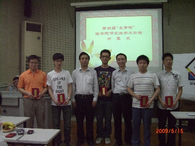 阅读次数: 发布时间:2009-05-19理学院第四届“长青杯”研究生学术论坛于5月15日下午在丁家桥校区教学楼113理学院多媒体教室落下帷幕。作为院研究生会主办的一年一度的研究生学术交流盛会,此次活动得到了院领导的高度重视和各位老师、同学的大力支持。院党委书记彭光成、院长沈临江、副院长姚成、朱红军以及王锦堂、任小明教授等领导和老师出席了此次论坛的闭幕式。