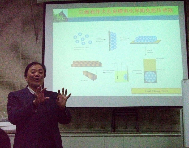 此次报告,朱教授首先介绍了量子点(QDs)及用纳米粒子(NPs)修饰的金属电极及其探针等三维有序电化学功能材料一系列的光学及电化学性质,及其在化学免疫分析、生物传感等应用领域的作用。同时,还详细介绍了其课题组在这一研究方向中所做的工作以及所取得的一些成果。整场报告会在热烈的气氛中进行,朱教授的报告深入浅出,受到与会师生的一致好评。讲座结束后与会老师和同学们分别就讲座内容及自己所关心的问题和朱教授进行了讨论与提问,现场充满了浓重而热烈的学术氛围。