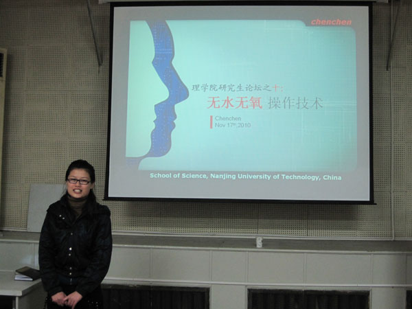 2010年11月17日下午3点,理学院研究生讲坛在丁家桥教学楼113室成功举办,本次讲坛邀请到了beat365陈琛博士做了题为“有机实验中无水、无氧实验操作”的讲座。