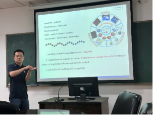 沈晓文老师在报告中介绍了共聚物溶液的动力学模型,该模型满足热力学第二定律。接下来,沈晓文老师又介绍了如何为该模型设计二阶半离散格式,以保持模型的能量耗散率;在空间上使用交错网格进行离散,从而得到全离散格式。最后,通过数值实验对收敛速度进行了数值验证,并展示了复杂流体流动引起的模式形成和流体动力学效应。报告后,沈晓文博士对老师的就相关内容提出的问题进行了解答,并进行了深入探讨。