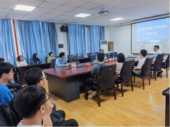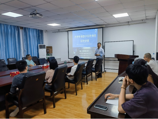 报告中,喻松教授对连续变量类协议的原理、优势和研究动态进行了总结;并从新时代国家综合PNT(定位、导航和授时)体系的需求出发,对量子时频传递的原理和研究动态进行了报告。报告内容精彩纷呈,生动有趣,能有效让同学们了解量子信息技术研究现状和发展前景。报告后,喻松教授对老师们提出的问题进行了解答,并进行了深入探讨。