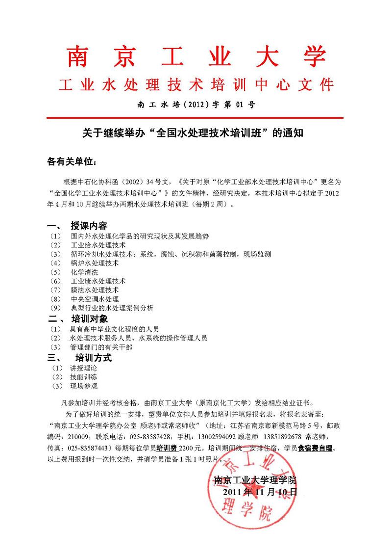 关于继续举办2012年“全国水处理培训班”的通知