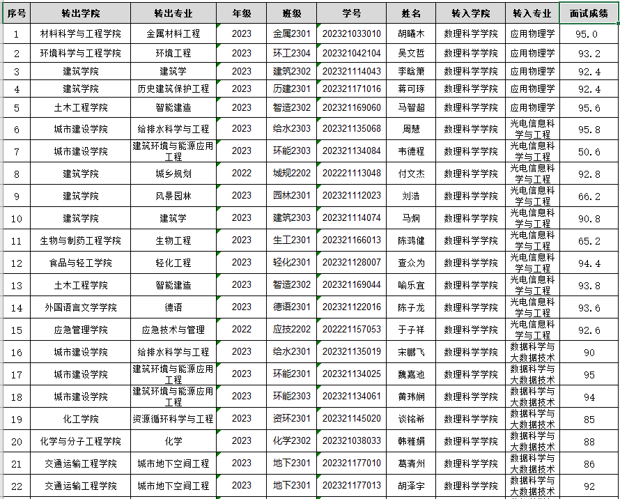 阅读次数: 发布时间:2024-07-10 更新时间:2024-07-11根据教务处《关于2024年本科生转专业笔试考核和部分专业面试考核安排的通知》(南工教〔2024〕59号),现将beat365官方网站2024年转专业有笔试专业面试考核成绩公示如下: