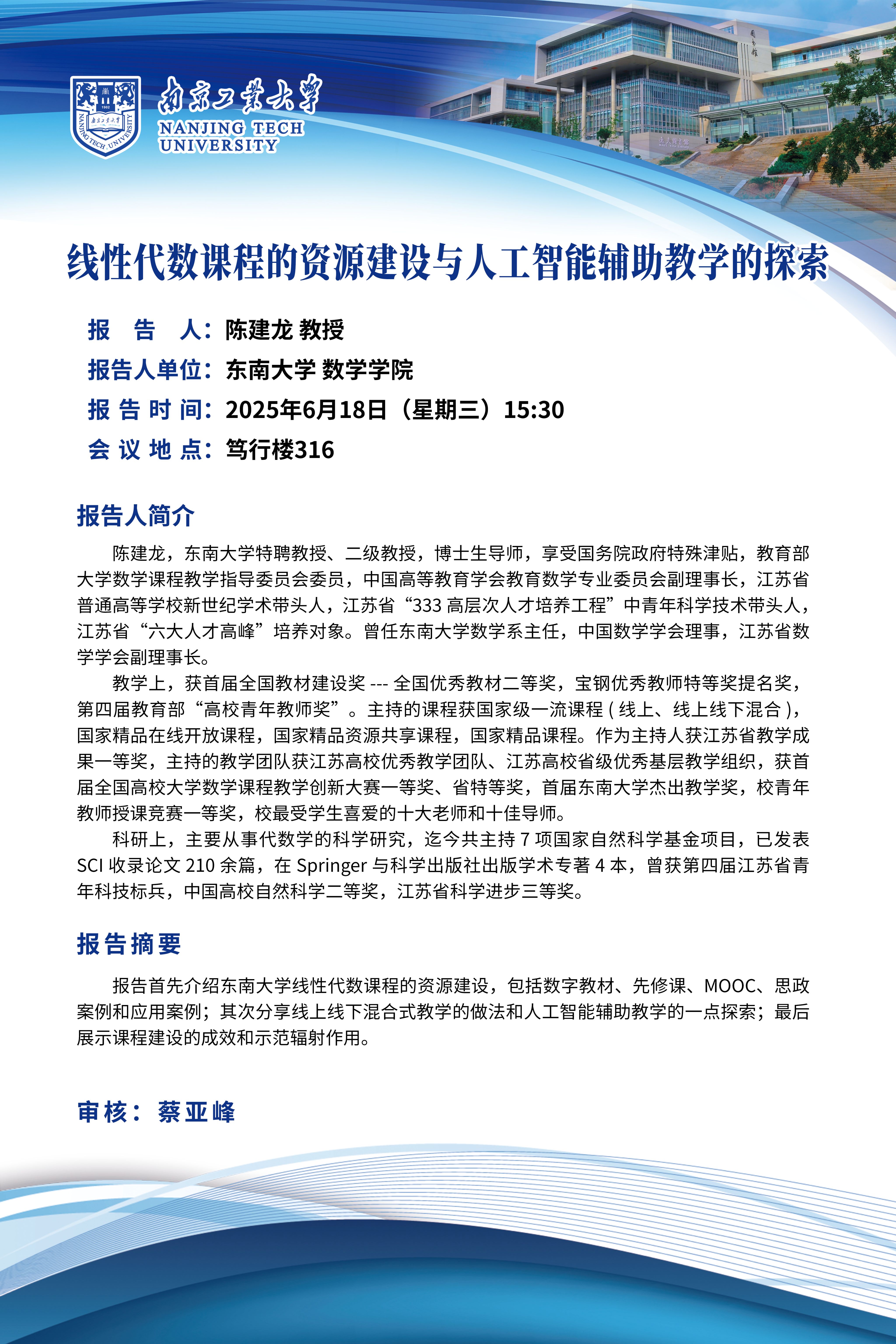 数理论坛第三十八期:东南大学陈建龙教授作报告“线性代数课程的资源建设与人工智能辅助教学的探索”
