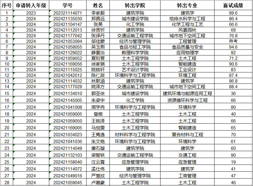 阅读次数: 发布时间:2025-06-16 更新时间:2025-06-16根据《关于开展2025年本科生转专业工作的通知》(南工教〔2025〕42号)要求,现将beat365官方网站2025年转专业面试考核成绩公示如下。如对面试成绩有异议,请在公示期内反映。