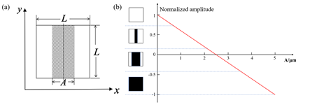 图1. 准多值化编码方法原理示意图。(a)一个畴结构元胞;(b)在远场的振幅调制随元胞阴影区域宽度的变化关系。