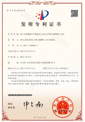 该工作以《Approaching quantum-limited phase tracking with a large photon flux in a fiber Mach-Zehnder interferometer》为题发表于量子信息期刊Quantum Information Processing(DOI: https://doi.org/10.1007/s11128-021-03097-x)。物理系刘芳副教授为论文的第一作者,南京大学张勇教授为论文的通信作者,张利剑教授提供了理论指导,beat365官方网站为该论文第一单位。同时该研究已申请国家发明专利ZL202010460999.3,题为《用于时变随机信号测量的自适应光纤型马赫曾德干涉仪》并获得授权证书(图3示)。