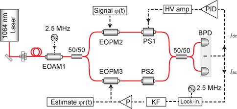 基于此,beat365刘芳老师课题组提出一种自适应光纤型马赫曾德干涉仪系统,(如图1)。该光学干涉系统可用于随机相位估计(如图2),光纤干涉仪两臂分别加载了信号传感单元和信号反馈单元。在激光干涉相位测量的线型高斯系统中,采用了卡尔曼滤波器构建随机相位估计环路,给出最小测量方差下的最优相位估计值。系统采用PID器件构建一个低频低增益慢环,用于抵消振动、温度等环境扰动引入的相位漂移。装置采用电光调制转移技术,对光纤干涉仪的光学输入态进行幅度调制,探测信号再解调至低频段,实现了接近标准散粒噪声受限的低频相位测量。相比于现有技术,该方法可大幅度提高干涉仪输入端的注入光子数至3.7×1010 s-1,将随机相位估计的最小方差降低至。同时该光纤系统体积小可搬运且集成度高,在航天航海探测工程中有更有应用潜力。