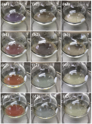 本课题组在之前研究基础上(Nanomaterials 2018, 8, 161),提出了一种改进方法,即将银纳米“晶种成核”与“纳米线生长”进行分离,成功制备了直径小于30 nm、长径比高达2500、产率达91%的AgNWs。由于氧化蚀刻作用,氧不仅对成核过程中的晶种大小、密度有影响,对生长过程中的AgNW长短影响也很大。控制好这两个过程中的氧含量,就能够控制好产物中银纳米结构的形貌,进而展现出不同的表面等离激元共振(SPR)吸收峰位,溶液颜色发生相应变化,实现“察颜观色”see“纳米结构”的目的。