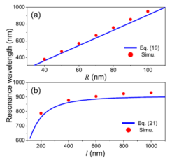 在此基础上,作者将光学或介电LC共振推广到任意形状的高介电振子,获得了一个普遍意义的介电LC共振频率公式。该共振频率与振子的折射率成反比,与振子形状或局域光场分布有关。利用这一结果,作者推导了无限长和有限长高介电圆柱的共振频率。其中,圆柱的光场分布利用Maxwell方程和迭代法解析获得,避免了求解圆柱内外的电磁场和边界条件匹配的使用。介电LC共振的理论结果和严格的米共振以及数值计算结果能够较好的吻合。