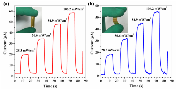 图2 在周期性照明(隔10秒)下,施加2.0 V偏置电压,观察不同辐照功率密度(532 nm可见光)下的动态光电响应。插图展示了测试器件的实物光学照片。(a)平直状态测试。(b)弯曲状态测试。