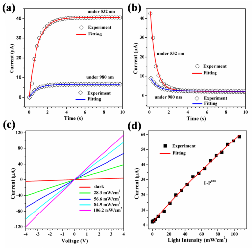 图1 在532纳米和980纳米波长光的辐照下,施加2.0伏特偏压时,光密度分别为85和120毫瓦/平方厘米的情况下的(a)上升曲线和(b)衰减曲线。(c)器件在532纳米照射下,不同光强度下的I-V曲线。(d)在2.0伏特偏置电压下光电流与入射光密度的关系。
