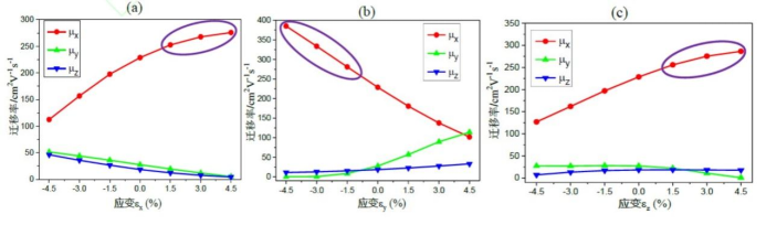图1 迁移率随应变的变化:(a)应变沿x方向;(b)应变沿y方向;(c)应变沿z方向