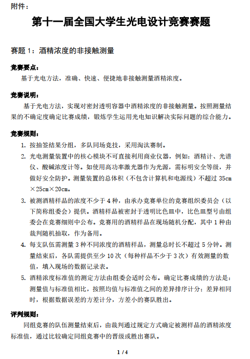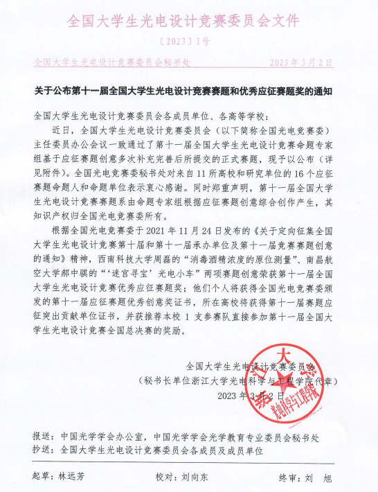 关于公布第十一届全国大学生光电设计竞赛赛题和优秀应征赛题奖的通知
